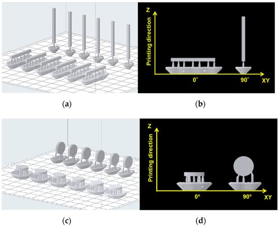 Specimens being 3D-printed in two directions: (a,c) STL data imported to the 3D printing software (n = 6); (b,d) print layer perpendicular to the loading direction (0°) and parallel to the loading direction (90°).