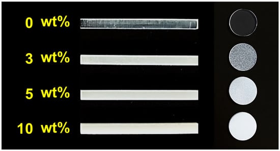 Finished specimens. Mass percentages of zirconia filler: 0 (control), 3, 5, and 10 wt.%. The specimen became opaque with increasing amounts of zirconia filler. This image was captured against a black background to make it easier to determine the color of the specimens.