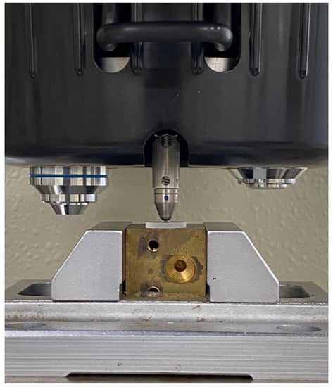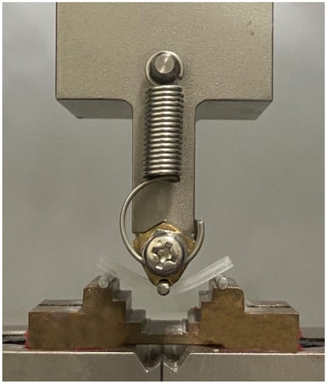 The three-point bending test was performed according to the ISO10477 standard [25]. For the bending test, a rectangular specimen with a length, width, and thickness of 25, 2, and 2 mm, respectively, was used (n = 6). A precision universal testing machine (AG-Xplus; Shimadzu, Kyoto, Japan) with a span distance of 20 mm and a crosshead speed of 1 mm/min was used; load was applied using a load plunger (Figure 6) to measure the flexural strength (FS, MPa), and it was calculated using Equation (1):