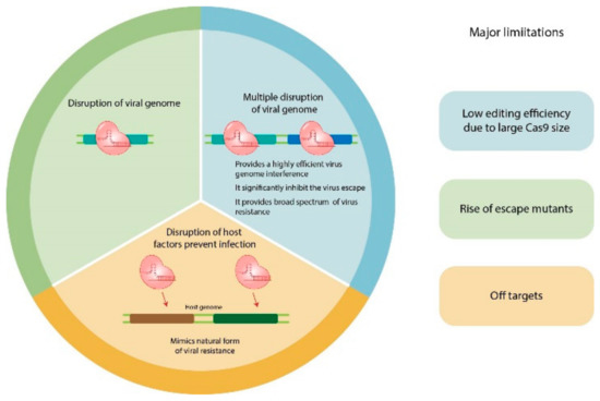 If two major antiviral strategies, RNA silencing and genome editing are compared, genome editing provides novel methods for the improvement of virus resistance. RNA silencing is a highly efficient and successful approach and has generated commercialized transgenic antiviral crops, but many viruses encode viral suppressors of RNA silencing to counter the defense of RNA silencing. These suppressors are able to disrupt the RNAi-mediated silencing process by targeting key components of RNAi pathways [94]. Another disadvantage of using the RNAi antiviral system is that high mutation rate (10–20%) in homologous viruses can abolish plant resistance [95]. A genome editing strategy such as the CRISPR/Cas system can bypass these disadvantages. Other gene editing approaches such as zinc finger nuclease and TALEN are not widely used due to issues of affordability and efficiency. The rapid development of CRISPR technology is a definite milestone and has advantages over other systems. Plant viruses do not possess the ability to counter CRISPR-based immune defense originated from prokaryotes. Furthermore, by editing host factors and removing gene editing CRISPR machinery by backcross, virus-resistant transgene-free plants can be generated. Moreover, new CRISPR-based systems such as multiplexed CRISPR or CRISPR-Act2.0 can also be used to develop broad spectrum resistance against different kinds of pathogens by targeting multiple pathogens [93] or by transcriptional activation of plant dominant resistance gene(s) [96], respectively. Nevertheless, these new systems also have limitations such as off targeting or production of escape virus mutants, but in a longer horizon, these problems can be solved (Figure 2).