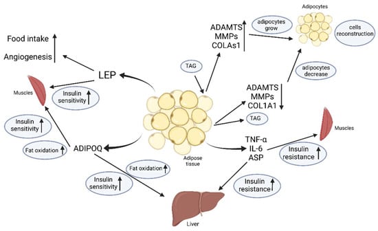 Selected adipokines and their effects on individual organs. LEP-leptin; ADIPOQ-adiponectin; TNF-α- Tumor necrosis factor α; IL-6-interleukin 6; ADAMTS- disintegrin and metalloproteinase with thrombospondin motifs; MMPs-matrix metalloproteinases; COL1A1-collagen alpha-1(I) chain; ASP-Acylation stimulating protein.