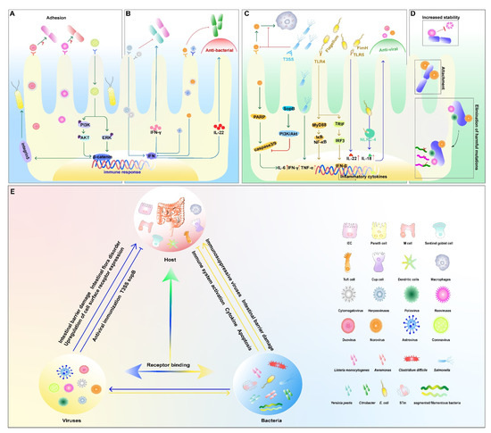 Bacterial and viral co-infection in the intestine. (A) viruses promote bacterial infections; (B) viruses inhibit bacterial infections; (C) bacteria inhibit viral infections; (D) bacteria promote viral infections; (E) the relationship among the host, viruses, and bacteria. An arrow between two elements means that the side being pointed at is activated. Conversely, the symbol (├) represents inhibiting effect. The symbol (↑) following the proteins represents increased expression.