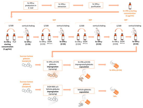 Representative scheme of the manufacturing process of the homeopathically prepared pillules of the vehicle-(Veh.) and the IFN-γ (4 CH) MI unitary. The Veh. pillules (or globules) are represented in white and the IFN-γ (4 CH)’s ones are represented in orange. The orange color used here is simply for the purpose of a better graphic understanding. The IFN-γ-impregnated pillules are white, so is the Veh., as the impregnation step does not change their appearance. hr: human recombinant; SKP: serial kinetic process.