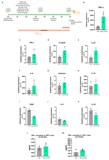 Human monocytic THP-1 cells, extensively used for studying the immune response capacity of monocytes and monocyte-derived macrophages, have the ability to produce and secrete cytokines in response to LPS (1 μg/mL) [26], similarly to primary PBMC-derived macrophages [27]. For this reason, in order to confirm the findings and include one more in vitro model, THP-1 cells were cultivated with IFN-γ (4 CH) or Veh. in combination with LPS for 24 and 30 h. Then, the secretion of the pro-inflammatory cytokines TNF-α and IFN-γ has been investigated. As expected, LPS increased remarkably the levels of secreted TNF-α after 24 and 30 h, while IFN-γ was not detected by the ELISA. Figure 5L,M shows the results of the tested IFN-γ (4 CH) and its control (Veh.) It can be observed that, after both 24 and 30 h of treatment, IFN-γ (4 CH) slightly increased the secreted levels of TNF-α corresponding to about 40 pg/mL after 24 h (Figure 5L) and to about 85 pg/mL after 30 h (Figure 5M). Although the magnitude of effects is quite lower compared to the one reported in CD14+ cells for the same cytokine, on the whole, the results are consistent. Once again, these experiments have only been performed once and inferential statistics were not performed. However, these results tend to demonstrate that IFN-γ (4 CH) could have a stimulatory effect on the secretion of a panel of pro-inflammatory cytokines, and especially TNF-α, in both human monocytic cell line and human primary monocytic-derived macrophages, under LPS exposure.