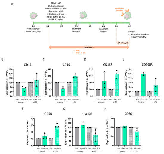 CD14+ cells were freshly isolated from PBMC thanks to the Miltenyi kit (130-050-201). Briefly, the cells were then seeded at the density of 50,000 cells/well in 96-well plates on Day 0 and were cultivated in RPMI 1640 supplemented with 2% inactivated human serum, 1 mM non-essential amino acids, 1 mM pyruvate, 2 mM L-glutamine, 10 mM HEPES buffer and 50 ng/mL M-CSF. Cells were treated with vehicle or IFN-γ (4 CH) from Day 1 until Day 7, both medium and treatments being renewed on Day 3 and Day 5. The experimental scheme is shown in Figure 5A.