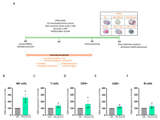 IFN-γ (4 CH) enhances the activation of CD3-pre-primed immune cells in vitro. (A) Representative scheme of the experimental protocol. Human PBMCs from three healthy donors were cultivated during 48 h in classical culture conditions in presence of anti-CD3 (0.5 µg/mL) plus IFN-γ (4 CH)/Veh. The cells were immuno-stained at D2 and their activation status, characterized by the CD69 expression, was analyzed by flow cytometry at D3. Each cell subpopulation (NK cells, monocytes/macrophages, granulocytes, B cells, T cells, [CD4+ and CD8+]) was discriminated according to the expression of the markers referred in the Material and Methods section. The CD69 expression was assessed within the different subpopulations: NK cells, T cells, CD4+ T cells, CD8+ T cells and B cells (B–F). Each histogram represents the mean ± SEM of the CD69 expression obtained for each individual donor as a percentage of the IFN-γ (4 CH)-treated-condition CD69 expression normalized to the Veh-condition. Each individual point (black dot) represents the average of a triplicate per donor. In all the presented graphs, black dot lines were drawn to better visualize the effect of MIM compared to its Veh. control.