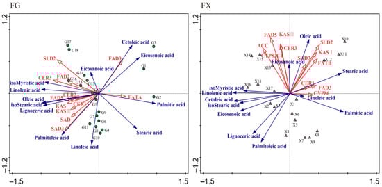 2.3. Correlation and Redundancy (RDA) Analysis of Fatty Acid Content and Synthesis-Related Genes