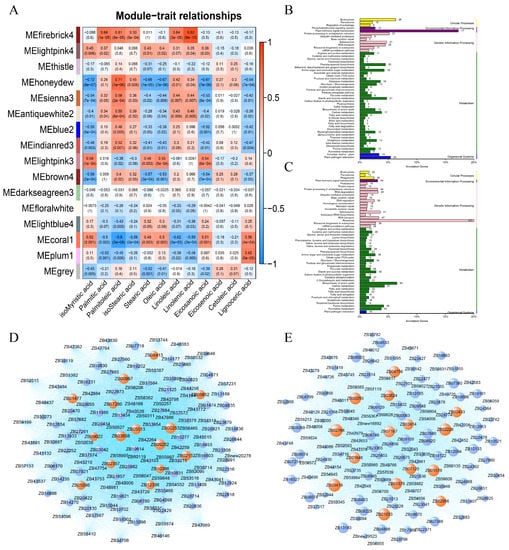 2.4. Weighted Gene Co-Expression Network Analysis (WGCNA) of Fatty Acids and Transcriptome in Response to Low Temperature in Z. bungeanum