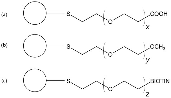 Considering described critical factors concerning DTDSs’ formation and the lack of comprehensive studies in this field, we decided to investigate the efficiency of GNP-based cisplatin delivery systems formation (including reaction kinetics), as compared to the nanocarrier surface functionalization type. Cisplatin (cis-dichlorodiammine platinum(II), an anticancer drug) was chosen due to its high cytotoxic potential and frequent use in chemotherapy (40–80% of all treated patients). Its effective binding can overcome well-known side effects and improve the therapeutic effect [6]. Despite the broadly described multiple examples of GNP surface modification and the variety of gold nanoparticle–cisplatin systems’ (GNCSs) formation protocols, there is no research concerning the direct and quantitative comparison of various functionalization types of impact on such conjugates’ formation efficiency and stability. Only a few works can be found in the literature, which suggest using the modifiers terminated with carboxylic moieties for this purpose [16]. According to in vitro (cell culture) and in vivo (animal) studies, GNCSs with specified surface coatings were reported to exhibit an improved therapeutic effect on cancerous cells (compared to that of the cisplatin used alone) [11,16]. Based on those reports, the presented work focuses on assessing various GNP coatings’ impacts on cisplatin binding efficiency. In our research, the conducted examinations employ three types of commercially available GNPs differing the length of surface modifier (PEG) and terminal group type responsible for drug binding (carboxyl-, methoxyl-, and biotin; see Figure 1).