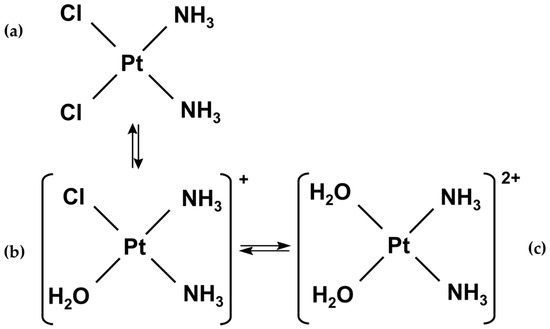Scheme of reaction of cisplatin activation: (a) cisplatin intact form; (b) cisplatin intermediate form; (c) cisplatin activated (derivative) form.