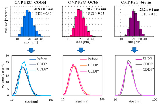 Values of hydrodynamic diameters (HDs) of gold nanoparticles (GNPs) and gold nanoparticle–cisplatin systems (GNCSs) obtained by means of dynamic light scattering (DLS). Top row presents histograms captured for each type of nanoparticle before modification (n = 3). Bottom row shows exemplary nanoparticle size distribution curves before and after modification with intact cisplatin (CDDP) and cisplatin derivative (CDDP*). HDs’ values for each modification were: GNP-PEG-COOH/CDDP (1:800)—21.3 ± 0.1 nm; GNP-PEG-COOH/CDDP* (1:800)—20.6 ± 0.4 nm; GNP-PEG-OCH3/CDDP (1:400)—20.0 ± 0.2 nm; GNP-PEG-OCH3/CDDP* (1:400)—20.5 ± 0.5 nm; GNP-PEG-biotin/CDDP (1:400)—23.5 ± 0.3 nm; GNP-PEG-biotin/CDDP* (1:400)—23.0 ± 0.3 nm.