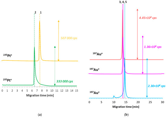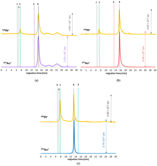 The electropherograms of such prepared samples are presented in Figure 8. The newly formed species of 197Au+ and 195Pt+ were registered on electropherograms (signal no. 4), corresponding to formed nanoconjugates. In all these cases, the migration time (MT) of 197Au-containing peaks differs from the MT of GNP substrates, confirming the formation of GNCSs. Moreover, the vanishing of CDDP* peak (no. 2) in all cases was observed, while small peaks of intact cisplatin appeared. Additionally, in Figure 8a,c, the newly not intense peak is visible at the MT placed between CDDP and CDDP* signals (no. 5), suggesting the formation of the intermediate cisplatin form. The presence of CDDP and intermediate drug form confirms that the reaction equilibrium was partially moved into the substrates. In parallel, the rest of the CDDP* molecules present in the mixture underwent conversion into GNCSs. Furthermore, intense and broad peaks with irregular shape in 195Pt+ and 197Au+ traces of GNP-PEG-biotin/CDDP* sample electropherogram (Figure 8a) point to the formation of aggregates/agglomerates, which still can attach the activated drug.