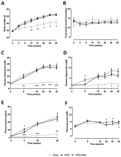 Heat-inactivated A. muciniphila did not affect development of obesity or associated metabolic risk factors. Ldlr−/−.Leiden mice were fed a chow reference diet (chow; grey line) or a NASH-inducing high-fat diet without (HFD; black line) or with supplementation of heat-inactivated A. muciniphila (HFD + Akk; dashed line) for 28 weeks. (A) Body weight; (B) food intake; (C) fasting plasma cholesterol; (D) fasting plasma triglycerides; (E) fasting plasma insulin; and (F) fasting blood glucose over time. Data shown are mean ± SD. * p < 0.05; ** p < 0.01; and *** p < 0.001 vs. HFD.