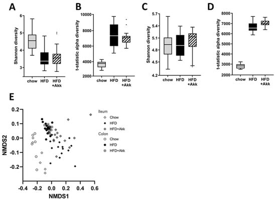 Heat-inactivated A. muciniphila has minor effects on mucosal gut microbiota in ileum and colon. Ldlr−/−.Leiden mice were fed a chow reference diet (chow) or a NASH-inducing high-fat diet without (HFD) or with supplementation of heat-inactivated A. muciniphila (HFD + Akk) for 28 weeks. (A) Shannon index (sensitive for high-abundance bacteria) in ileum; (B) tail statistic (t-statistic; sensitive for low-abundance bacteria) in ileum; (C) Shannon index in colon; (D) tail statistic in colon; (E) visualization of total microbiota ordination in ileum and colon with non-metric multidimensional scaling (NMDS) using the Bray–Curtis index.