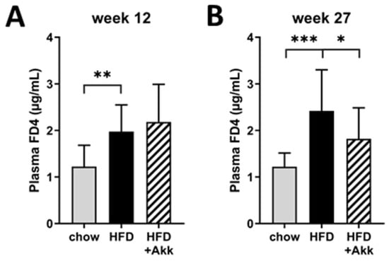 To investigate the effects of heat-inactivated A. muciniphila on gut barrier function, we performed an in vivo gut permeability test (FD4 test) in week 12 and 27 of the study. Gut permeability was significantly increased by HFD feeding in week 12 of the study (Figure 3A), particularly at the end of the study (Figure 3B). Heat-inactivated A. muciniphila was not able to prevent the initial HFD-induced increase in gut permeability observed in week 12, but prolonged treatment prevented further increase with significantly improved gut barrier function relative to HFD in week 27 (Figure 3A,B).