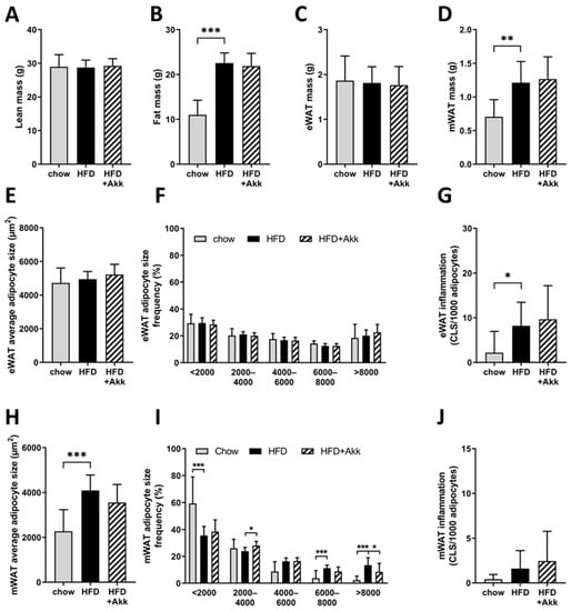 Heat-inactivated A. muciniphila did not affect adiposity but did improve adipocyte hypertrophy in the mesenteric depot. Ldlr−/−.Leiden mice were fed a chow reference diet (chow) or a NASH-inducing high-fat diet without (HFD) or with supplementation of heat-inactivated A. muciniphila (HFD + Akk) for 28 weeks. (A) Total lean mass; (B) total fat mass; (C) epididymal white adipose tissue (eWAT) mass and (D) mesenteric white adipose tissue (mWAT) mass at the end of the study; (E) average adipocyte size in eWAT; (F) distribution of eWAT adipocytes over 5 size ranges in µm2 and (G) eWAT inflammation; (H) average adipocyte size in mWAT; (I) distribution of mWAT adipocytes over 5 size ranges in µm2 and (J) mWAT inflammation. CLS: crown-like structures. Data shown are mean ± SD. * p < 0.05; ** p < 0.01; and *** p < 0.001 vs. HFD.