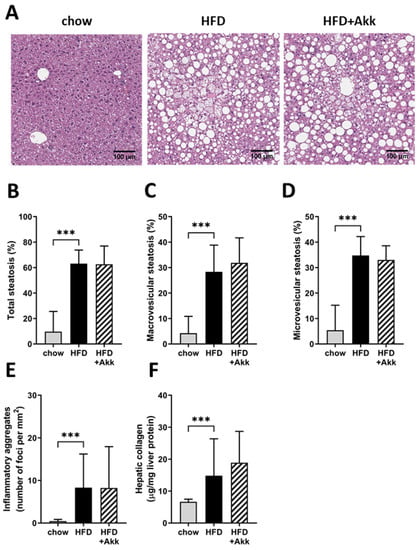 Next, we analyzed the development of NASH in HE-stained liver cross sections (representative photomicrographs shown in Figure 5A). HFD-fed controls developed pronounced hepatic steatosis relative to chow (Figure 5B), which was roughly half in the macrovesicular form (Figure 5C) and half in the microvesicular form (Figure 5D). Treatment with heat-inactivated A. muciniphila did not influence the development of steatosis in the liver or the distribution of steatosis over the macrovesicular and the microvesicular form (Figure 5A–D). HFD feeding also induced hepatic inflammation relative to chow, which was not affected by heat-inactivated A. muciniphila (Figure 5E). Development of hepatic fibrosis was assessed by the biochemical analysis of hepatic collagen content, which showed significant induction in hepatic collagen in HFD relative to chow (Figure 5F). Heat-inactivated A. muciniphila did not affect the deposition of collagen in the liver (Figure 5F). In line with these findings on liver histopathology, HFD feeding increased levels of several circulating bile acids (as gut–liver crosstalk mediators), including those increased in human NASH relative to healthy controls [], which were not significantly affected by heat-inactivated A. muciniphila (Table 3).