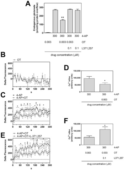 Collectively, the findings indicate that 4-AP elicited Ca2+ entry in striatal astrocyte processes and evoked release of glutamate from the processes. Also, activation of OT receptors was able to inhibit both the 4-AP-evoked Ca2+ entry and the glutamate release from the processes.