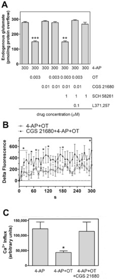 2.3. Activation of A2A Receptor Prevents the Oxytocin Inhibition of Glutamate Release from Striatal Astrocytic Processes