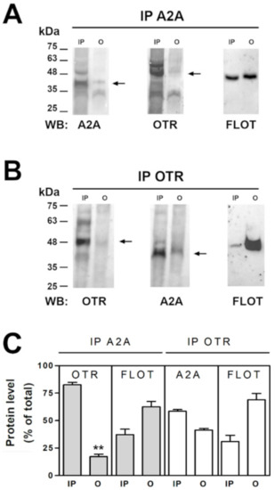 The capability of A2A and OT receptors on striatal astrocytes to physically interact was investigated by co-immunoprecipitation assay on purified striatal astrocyte processes. By coimmunoprecipitation we found that the A2A and the OT receptors expressed on the striatal astrocytic processes physically interact. Particularly, as shown in Figure 5, by analyzing immunoprecipitated (IP) and not immunoprecipitated (O, output) material by immunoblotting using the anti-OTR and the anti-A2A antibodies we found that the OTR immunoprecipitated together with the A2A receptor (Figure 5A,C) and a fraction of the A2A receptor immunoprecipitated together with the OTR (Figure 5B,C). The findings indicate that the OT receptor expressed on the striatal astrocytic process is associated with the A2A receptor. Moreover, a fraction of flotillin-1, a marker of the membrane lipid rafts [41], coimmunoprecipitated with both the OT and the A2A receptors (Figure 5A–C) suggesting that the receptor complexes were enriched in lipid rafts.