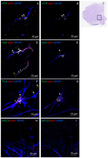 Striatal astrocytes express OT receptors, A2A receptors and A2A-OTR heterodimers. (A,B,D,E) The presence of the studied receptors was assessed with immunofluorescence and confocal analysis using primary antibodies (rabbit polyclonal anti-A2A receptor (D,E), rabbit polyclonal anti-OTR (A,B), goat polyclonal anti-GFAP and mouse monoclonal anti-ezrin (A,B,D,E) in rat hemibrain slices. (A,D) The merge of the maximum intensity projections of a representative field (240 × 240 µm; z 10 µm) is shown; GFAP (blue), ezrin (red), OTR (green, (A,B)) or A2A (green, (D,E)). (B,E) Merged confocal images of a single z stack of the image shown in (A) or (D). (F,G) The detection of in situ Proximity Ligation Assay (PLA) A2A-OTR heteroreceptor complexes was carried out with immunofluorescence and confocal analysis using primary antibodies (mouse monoclonal anti-A2AR, rabbit polyclonal anti-OTR) in rat hemibrain slices. F. The merge of the maximum intensity projections of a representative field (240 × 240 µm; z 10 µm) is shown; GFAP (blue), ezrin (red), PLA for A2A-OTR heteroreceptor complexes appears as green dots. G. Merged confocal images of a single z stack of the image (F). (C) Cresyl violet staining of the nearest slice used in (F). (H,I) A complete lack of stain for PLA A2A-OTR heteroreceptor complexes was obtained in the negative control experiments, performed avoiding the conjugation of a primary antibody with the Duolink Probes. In the figure the merges of the maximum intensity projections of a representative field ((H); 240 × 240 µm; z 10 µm) and a single z stack (I) are shown. Scale bars are indicated in the figures. White arrows indicate localization of OTR (A,B), A2A (D,E) or PLA dots (F,G) on ezrin-positive structures. White asterisks indicate localization of OTR (A), A2A (D,E) or PLA dots (F) on GFAP-positive structures.