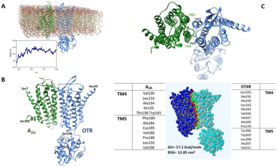 Molecular Dynamics (MD) simulations in a lipid bilayer of the A2A-OTR dimeric structure estimated by docking methods (Figure 7A) showed that the overall root mean square deviation (RMSD) of the Cα atoms increased at the beginning of the unrestrained phase of the simulation and then stabilized at about 3.7 Å, indicating that the structure reached a stable conformation at 300 °K (shown in Figure 7B). As reported in Figure 7C, the residues predicted to be mainly involved in the heteromerization interface are located in the transmembrane domains 4 and 5 (TM4 and TM5) of both A2A and OTR.