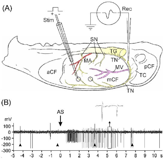 Each hemisected skull was transferred to a transparent acrylic chamber, embedded in Agar-Agar (Kobe I, Roth, Karlsruhe, Germany) with the cavity facing up, and covered with SIF (see Figure 1A). Under observation with a stereo-microscope (Leica MS5, Leica Microsystems, Wetzlar, Germany), the trigeminal ganglion was removed, and one of 2–3 meningeal branches of the mandibular nerve (V3), collectively called spinosus nerve, or the tentorius nerve, a branch of the ophthalmic nerve (V1), was freed from the surrounding dura and soaked with its free end into a glass pipette (tip diameter ≈20 µm) filled with SIF. The preparation was then continuously superfused with warm SIF in an open circulation with a flow velocity of 6 mL/min. The temperature was held constant by a flow-through Peltier element placed in series with the superfusion system and fed back by a thermocouple placed inside the tissue bath. The experiments were conducted at room temperature (24 °C), at which TRPA1 receptor channels are sensitive to stimuli and Angeli’s salt solution is sufficiently stable.