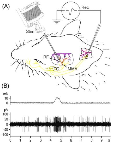Custom-made carbon-fibre glass microelectrodes (impedance 1–2 MΩ) were inserted into the medulla on the side of the cranial window and moved at steps of 2.5 µm through the SpVc using a custom-made microstepper. The reference electrode was inserted subcutaneously nearby the recording electrode. Neurons with meningeal afferent input were identified by their responses to gentle mechanical probing of the exposed dura mater with von Frey filaments (2.9–11.8 mN), and meningeal receptive fields were characterised by their position and the mechanical threshold of the recorded neurons. Likewise, facial receptive fields were mapped by probing the temporal muscle; the skin of the ophthalmic (V1), maxillary (V2), and mandibular divisions of the trigeminal nerve; and the cornea. A custom-made mechano-stimulator with a blunt probe was adjusted to stimulate the dural receptive field with a constant force of about 1.5 times the threshold for 1 s every minute during the recording period (see Figure 3B). The recorded signals were band-passed and amplified (custom-made amplifier); then, they were digitised at a sampling rate of 20 kHz using a CED1402 controlled by Spike2 software (Cambridge Electronic design, Cambridge, United Kingdom). At the end of the experiment, a bipolar electrode was attached to the meningeal receptive field and the latency at just suprathreshold stimuli of 0.5 ms duration was assessed to calculate the conduction velocity of the primary afferent input. The position of the recorded neurons within the brainstem was approximately determined by the x–y position of the recording electrode and the recording depth.