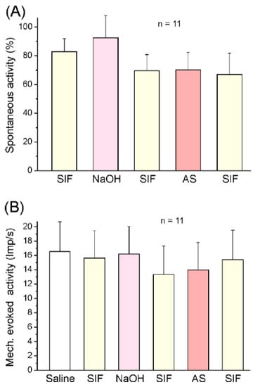 Mean spontaneous activity ((A), normalised) and mechanically evoked activity (B) at 5-min intervals of the sample of 11 neurons after application of SIF, NaOH (vehicle), and Angeli’s salt solution (AS). No significant differences; error bars indicate SEM.