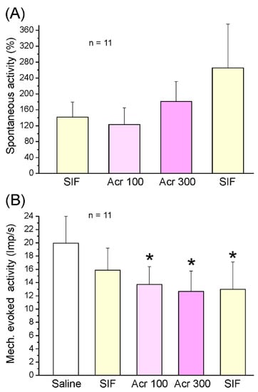 Mean spontaneous activity ((A), normalised) and mechanically evoked activity (B) at 5 min intervals of the sample of 11 neurons after application of SIF and acrolein (Acr) at 100 and 300 µM. * Significant difference to baseline (saline); error bars indicate SEM.