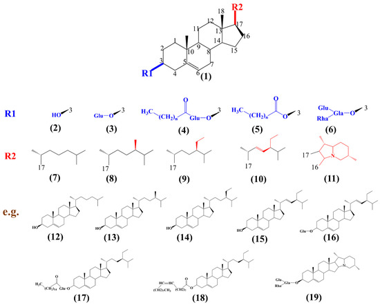 The chemical structure of free sterols and conjugated sterol. R1 at C3 and R2 at C17 determine the diversity of sterols. (1) Tetracyclic skeleton of sterol; R1 determines the type of compound including, (2) free sterol, (3) steryl glucosides, (4) acylated steryl glucosides, (5) steryl esters, (6) steroidal glycoalkaloids. R2 determines the diversity of compounds. For example, the combination of (2) and (7) makes cholesterol (12), the combination of (2) and (8) makes campesterol (13), the combination of (2) and (9) makes β-sitosterol (14), the combination of (2) and (10) makes stigmasterol (15), the combination of (3) and (10) makes stigmasteryl glycose (16), the combination of (4) and (9) makes sitosteryl palmitoyl glucoside (17), the combination of (5) and (9) makes stigmasteryloleate (18), while the combination of (6) and (11) makes α-solanine (19). The differences in the R1 group and R2 group are shown in blue and red, respectively.