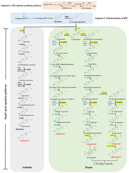 To date, a growing number of studies have been performed in the field of sterol biosynthesis [12,13]. This biosynthesis pathway can be divided into three major segments: (i) the mevalonate synthesis pathway, (ii) polymerization of isopentenyl pyrophosphate (IPP), and (iii) the post-squalene pathway (Figure 2). The first two segments are conserved in all eukaryotes, whereas profound differences exist in the post-squalene pathway in animals, plants, and fungi. Thus, in this section, we aimed to summarize key enzymes in the post-squalene pathway of the plant sterols biosynthesis, which is crucial for plant responses to abiotic stress, mainly through maintaining the optimal balance between cholesterol and C24-alkyl sterols in plants, as well as changes in the ratio between sterols and sphingolipids [14].