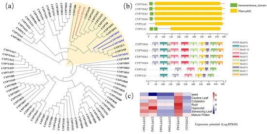 C22-sterol desaturase (CYP710, EC: 1.14.19.41) has been widely characterized to catalyze the synthesis of stigmasterol from β-sitosterol [46,47,48]. Overexpressing CYP710A1 and CYP710A11 in A. thaliana plants resulted in the content of stigmasterol increasing by more than six-fold [46]. New research indicated that CYP710A overexpression in W. somnifera not only significantly upregulated the level of stigmasterol, but also promoted accumulation of withanolides [49]. Notably, CYP710 belongs to the Cytochrome P450 superfamily, the largest enzyme family in plants which has been reported to participate in a variety of complex biological metabolic pathways and play crucial roles in plant development and stress tolerance [49,50,51]. Interestingly, CYP51, similarly to CYP710, belongs to the Cytochrome P450 protein family, and it catalyzes an essential early step in sterol metabolism, removing a methyl group from obtusifoliol and 31-nor-24(25)-dihydrolanosterol in plants [52]. Here, a phylogenetic tree of the Cytochrome P450 protein family (related to terpenoid synthesis) in A. thaliana was constructed to find that CYP51 and CYP710 are clustered together (Figure 3a). Furthermore, CYP710 and CYP51 are similar in conserved protein domains, motifs and gene expression patterns (Figure 3), suggesting that CYP710 might be evolved from CYP51, and might have the function of catalyzing demethylation of sterols and forming double bonds.