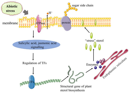 Role of plant sterols in response to abiotic stress. Under abiotic stress, the structure of the membrane is destroyed, which affects the permeability of the membrane and the activity of the membrane-bound protein, causing the loss of H+. Transcription factors are regulated by corresponding hormone signals to regulate the expression of structural genes of sterol biosynthesis to affect the content of “stress” sterols and ultimately maintain membrane stability.