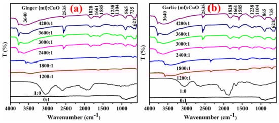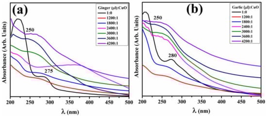 The visual characteristics of green synthesized CuO comprising hydro extracts of Gi and Ga with numerous ratios, i.e., 1200, 1800, 2400, 3000, 3600 and 4200 μL, were measured in the 200–500 nm range, as seen in Figure 1a,b. Absorption peaks of Gi and Ga root extracts presented by 1:0 (extract (μL):CuO) were depicted at 275 and 280 nm, respecitvely. Absorption decreased as the extract amount of CuO increased, whereas the highest absorbance in doped NPs was around 250 nm (3600 μL:1) followed by a redshift in Gi and Ga with the optimized product. This shift is attributed to the surface plasmon absorption of particles []. Abrupt color change and absorption at 250 nm indicate particle formation and completion of the reduction reaction. Hence, in Figure 1a,b, results suggest that absorption of synthesized NPs decrease with an increase or decrease in extract volume beyond the optimized ratio (3600 μL:1).