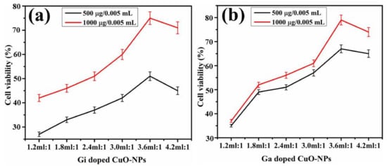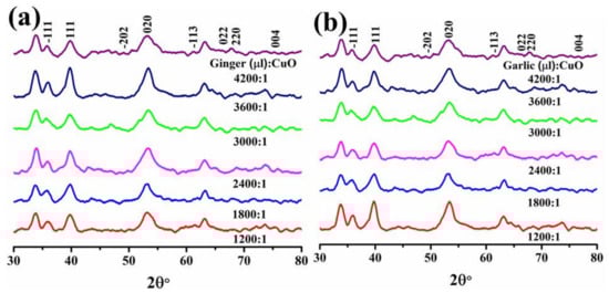 As shown in Figure 2a,b, XRD was used to determine crystal size, shape, and crystallinity of doped CuO NPs. XRD data show an increase in crystallinity after doping, with 2θ peak positions at 35.7°, 38.9°, 49.2°, 53.8°, 61.7°, 66.2°, 68.4°, and 75.3° corresponding to crystal planes (−111), (111), (−202), (020), (−113), (022), (220), and (004), respectively. The crystallite size was measured using Scherrer formula D = 0.9λ/βcosθ (where k is shape factor (0.9), θ is peak Bragg’s angle, λ is X-ray radiation wavelength (1.54 A°) and β is the broadening of the diffraction line measured at peak full width of half maximum (FWHM)) and ranged from 23.38 to 46.64 nm for Gi-doped CuO as shown in Figure 2a and 26–56 nm for Ga-doped CuO as shown in Figure 2b [].