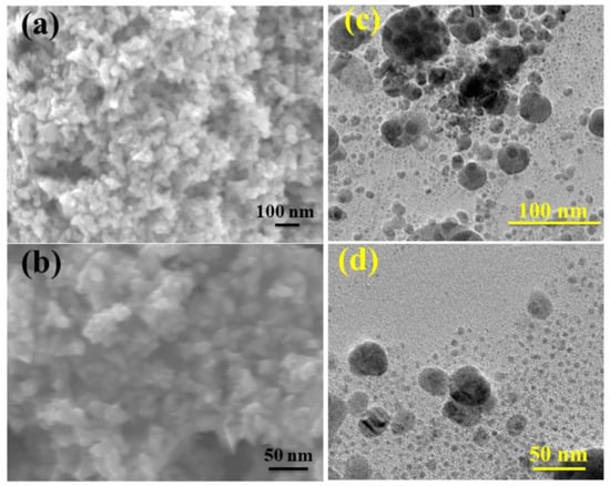 Sample morphology and the size of synthesized NPs were analyzed with the use of scanning and transmission electron (FE-SEM and FE-TEM) microscopes as presented in Figure 4a–d. Green synthesized CuO NPs displayed spherical structures and dense agglomeration, as shown in Figure 4a,b. From FE-TEM images, a high degree of agglomeration of doped NPs was observed. It is noteworthy that the particle size of doped NPs is less than 50 nm, as shown in Figure 4c,d. Dense agglomeration was observed in Ga-doped CuO NPs in comparison with Gi-doped NPs.