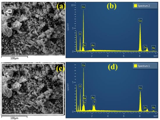 Energy dispersive X-ray spectroscopy (EDS) combined with SEM was used to investigate the elemental constitution of synthesized NPs. The EDS findingsin Figure 5b confirmed pure Cu phases with distinct peaks within 1 and 10 keV energy range. These peaks specifically indicate highly pure Cu in specimens under study. The atomic weight percentages recorded with the spectra for Cu and O were 82.81% and 15.76%, respectively, for Gi-doped CuO NPs. Figure 5c,d represents the EDS spectrum with an SEM image for Ga-doped NPs with atomic weight percentages of Cu and O as 66.5% and 23.9%, respectively. Additionally, the Au peak seen in Figure 5b is attributed to the Au sputtered coating covering the sample for charge dissipation, and Zn can emanate from the sample holder during SEM examination. In Figure 5d, S corresponds to flavonoids, phenols, and enzymes capping fabricated CuO NPs [].