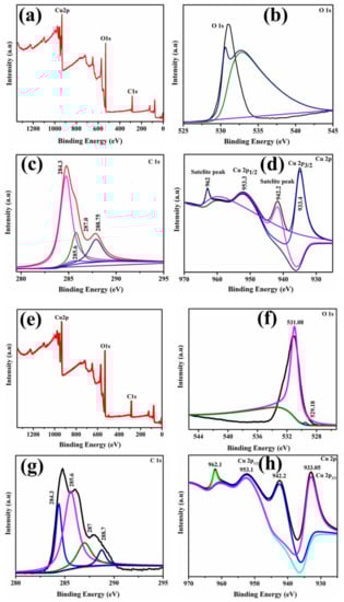 XPS spectra of Gi-doped CuO NPs (a) Survey (b) O1s orbitals (c) C1s spectra of CuO (d) Cu 2p (e) Survey spectra of Ga-doped CuO NPs (f) O1s (g) C1s (h) Cu 2p.