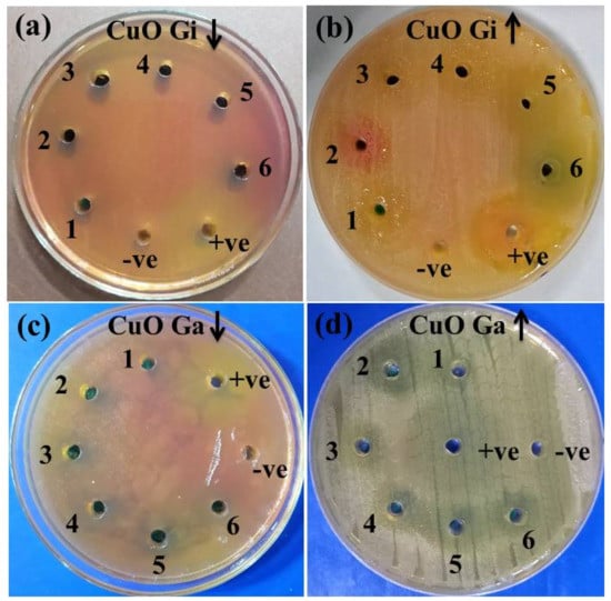 (a,b) In vitro bactericidal potential of CuO NPs doped with Gi extract at minimum (↓) and maximum (↑) doses (c,d) Ga-doped.