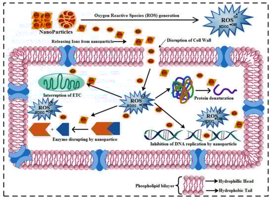 The variation in oxidative stress resistance, which is based on several aspects such as shape, composition, and particle size, plays a significant role in a synthesized nanomaterial’s antibacterial potential [,]. An electrostatic interface among bacterial strains and nanosized structures involves the production of reactive oxygen species causing cell fatalities [,,,,,]. Two reactions were found to be feasible for a nanomaterial bactericidal mechanism, the first of which is a heavy interaction between cations Cu2+ and bacterial cells with negativized sections accompanying collapse, followed by the second, which is a reaction that leads to electronic excitation of CuO valance band surfaces through irradiation. Additional electronic O2 reactions produce O−2 radicals, leading to the generation of H2O2. The resulting O−2 species have essential roles in the decomposition of the fat or protein molecules in the outer cell surface of the bacteria [,], as illustrated in Figure 9.