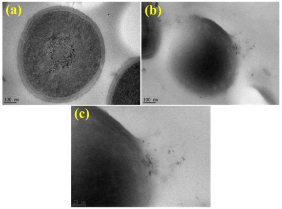 The TEM study of MDR S. aureus treated with doped CuO NPs clearly suggests that NPs are incorporated in substantial amounts, as presented in Figure 11a–c. However, it is not clear if bacterial cells employ an endocytosis mechanism for external entity acquisition. As a result, it is possible that doped CuO NPs infiltrate cells via disruption to the intact cell membrane, resulting in cytoplasmic permeability [].