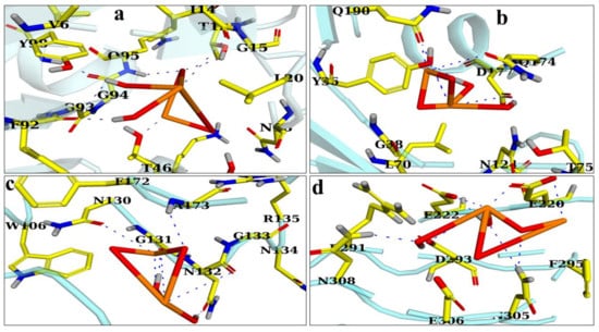Binding interaction pattern of CuO NPs with active site residues of (a) Dihydrofolate reductase, (b) Tyrosyl-tRNA synthetase, (c) Dihydropteroate synthase, and (d) D-alanine-D-alanine ligase from S. aureus.