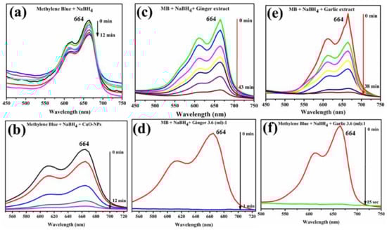 Figure 13a–f shows the dramatic drop in catalytic MB with roots CAE and extract-doped CuO NPs at an ambient temperature. The catalytic action of NaBH4 and conventional CuO NPs procured from Sigma-Aldrich is demonstrated in Figure 13a,b, and similarly, the catalytic behavior of CAE of Gi and Gi-doped CuO are shown in Figure 13c,d. The catalytic potential of Ga CAE and Ga-doped CuO NPs is illustrated in Figure 13e,f. A small decrease in absorption peaks was a result of the catalytic action of NaBH4 in 12 min, as shown in Figure 13a. Conventionally available CuO and CAE of Gi and Ga roots reduced MB in 12, 43, and 38 min (Figure 13b,c,e, respectively), which lies in comparison with the efficient (100%) reduction of dye in 1 min and 15 s for Gi and Ga extracts doped CuO NPs, as shown in Figure 13d,f.