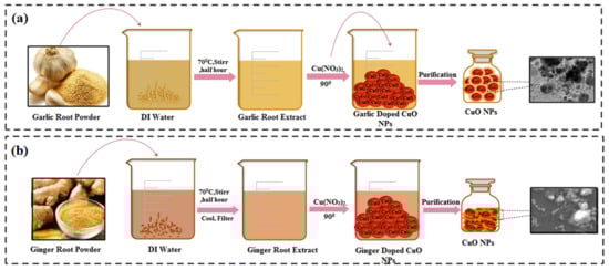 (a) Schematic illustration of the procedure followed in the green synthesis of CuO NPs from aqueous extracts of Garlic roots. (b) Steps involved in preparation of Ginger-doped CuO NPs.
