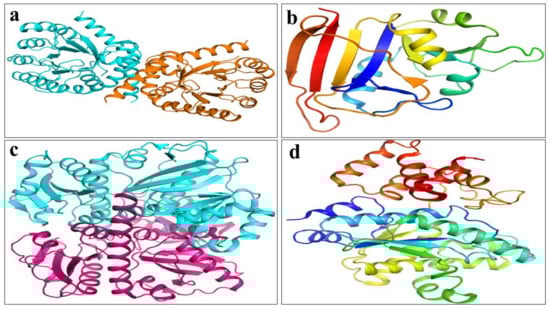 Three-dimensional structures of target proteins of S. aureus: (a) dihydropteroate synthase (PDB: 4HB7), (b) dihydrofolate reductase (PDB: 3FY8), (c) D-alanine-D-alanine ligase (PDB: 2I80), (d) Tyrosyl-tRNA synthetase (PDB: 1JIJ).