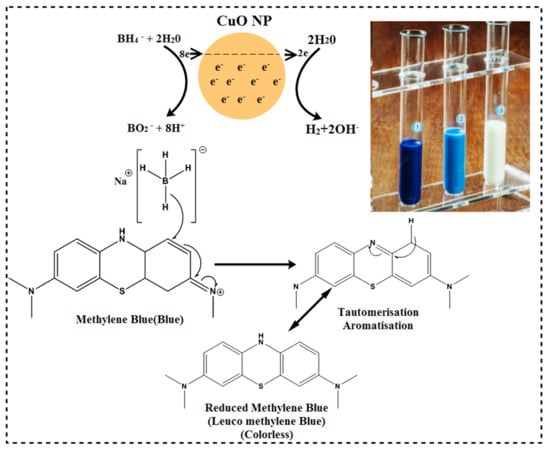 - Veisi, H.; Karmakar, B.; Tamoradi, T.; Hemmati, S.; Hekmati, M.; Hamelian, M. Biosynthesis of CuO nanoparticles using aqueous extract of herbal tea (Stachys Lavandulifolia) flowers and evaluation of its catalytic activity. Sci. Rep. 2021, 11, 1983. [Google Scholar] [CrossRef] [PubMed]