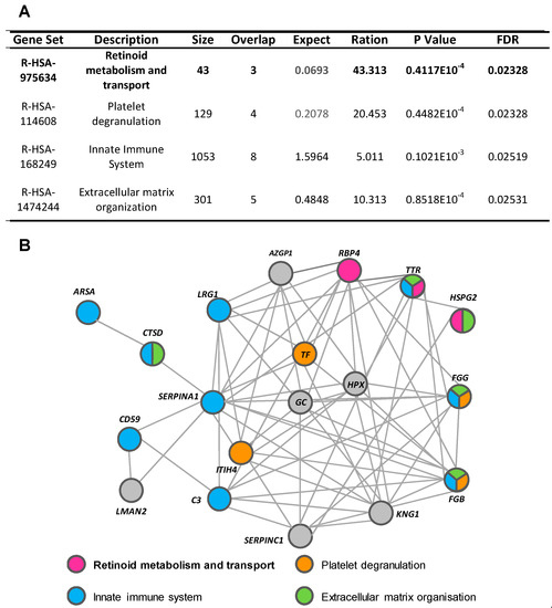 Using the WebGestalt and Reactome platforms, four biological/molecular pathways were found to be overrepresented among the 26 urine proteins with a differential detection pattern in ADHF (Q-value < 0.05; Figure 3A). These referred to retinoid metabolism and transport (R-HSA-975634), platelet degranulation (R-HSA-114608), innate immune system (R-HSA-168249), and extracellular matrix organization (R-HSA-1484244). Within the first group, three different proteins were identified: retinol-binding protein 4 (RBP4), transthyretin (TTR), and heparan sulphate proteoglycan 2 (HSPG2 or perlecan). Four proteins were related to platelet degranulation including fibrinogen β chain (FGB) and γ chain (FGG), serotransferrin (TF), and inter-α-trypsin inhibitor heavy chain H4 (ITIH4). Moreover, nine of the proteins differentially detected in the urine of ADHF patients were associated to the innate immune system, wherein eight were increased (fibrinogen γ chains (FGG), α-1-antitrypsin (A1AT), CD59 glycoprotein (CD59), cathepsin D (CTSD), arylsulphatase A (ARSA), complement C3 (C3), transthyretin (TTR), and leucine-rich α-2-glycoprotein (LRG1) and only the fibrinogen β chain was decreased. The extracellular matrix organization pathway included five proteins, FGG, TTR, and CTSD with increased levels and HSPG2 and FGB with decreased levels, in ADHF.