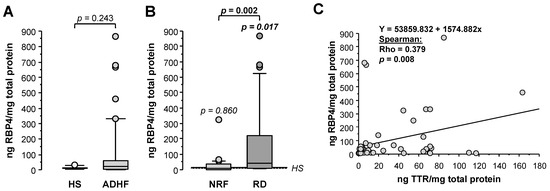 Retinol-binding protein 4 (RBP4), unlike results obtained by proteomics, showed 2-fold higher loss in urine for ADHF patients when compared with healthy subjects (HS), although differences did not achieve statistical significance (22.8 (3.8–60.9) vs. 11.9 (7.8–14.0) ng RBP4/mg total protein, p = 0.244, Figure 5A). Of note, ADHF patients with renal dysfunction (RD) at hospital admission had >4-fold higher RBP4 urine levels than those presenting normal renal function, who otherwise had urine values within the normal range (RD vs. NRF groups: 40.9 (9.5–248.7) vs. 9.7 (2.0–34.9) ng RBP4/mg total protein, p = 0.002, Figure 5B). A significant positive correlation was found between urinary levels of RBP4 and its transporter TTR in ADHF patients (Figure 5C).