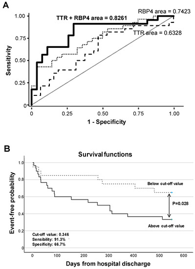 Kaplan–Meier analysis evidenced that values above a predicted probability of 0.346 (specificity 66.7%, sensitivity 91.3%) calculated from the AUC for combined urine levels of RBP4 and TTR at hospital admission associated with worse disease evolution and earlier presentation of major adverse events (cardiac and/or renal rehospitalization, heart transplant, or death, p = 0.028, Figure 6B) during the 18 months’ evolution follow-up.